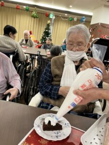 みなさんこんにちは癒しの里西亀有です🐢 先日施設で4Fのファミリー合同でクリスマス会を開催しました。 炊飯器で作成した2種類のスポンジケーキ(スポンジケーキ、チョコレートケーキ)をファミリーと一緒にホイップクリームでデコレーションしました。