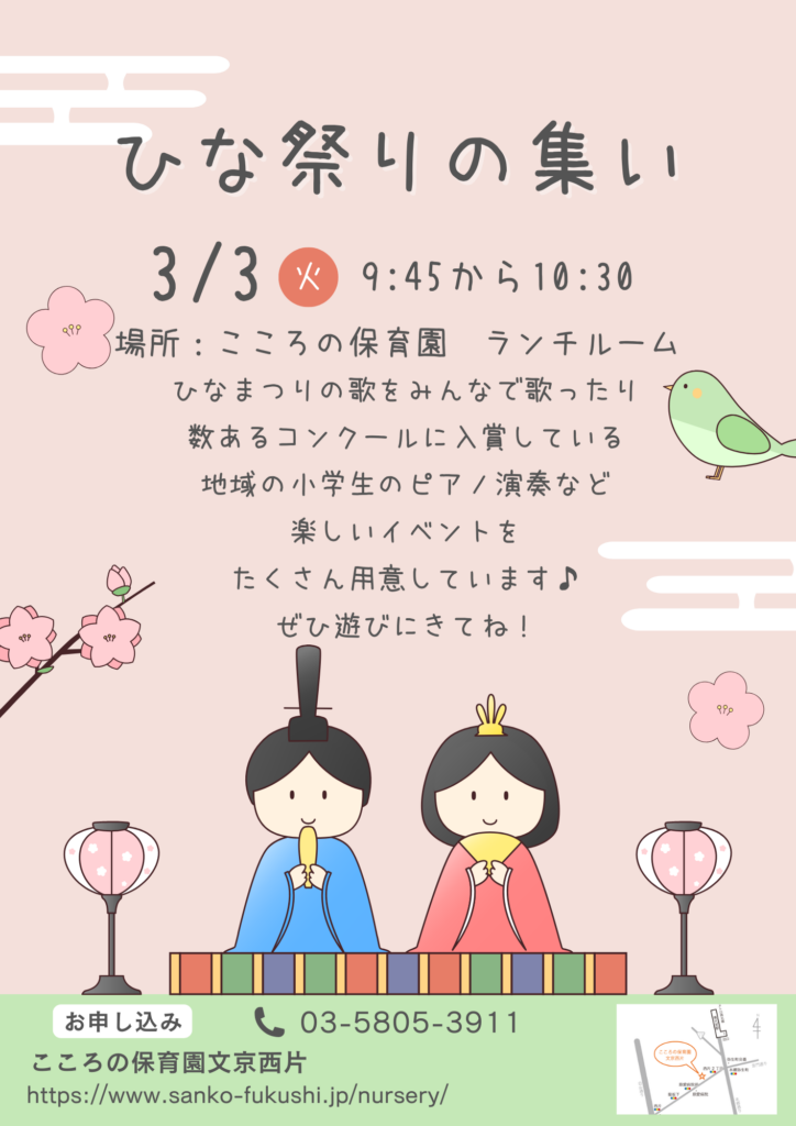 こころの保育園文京西片のひな祭りの集いを下記の通りに実施致します。