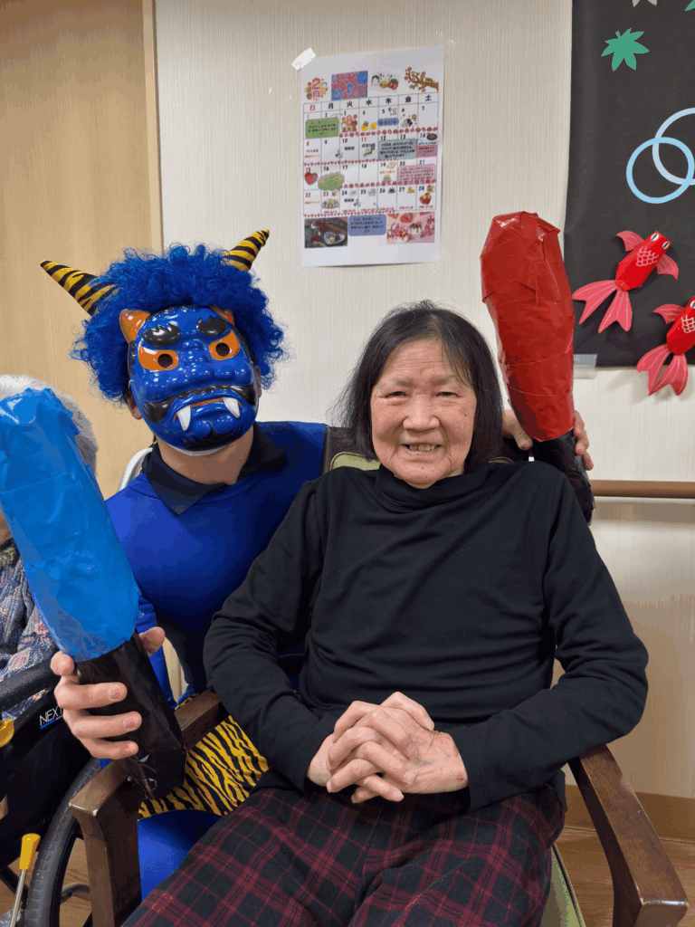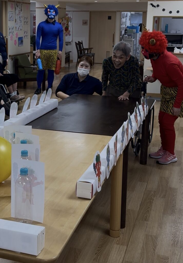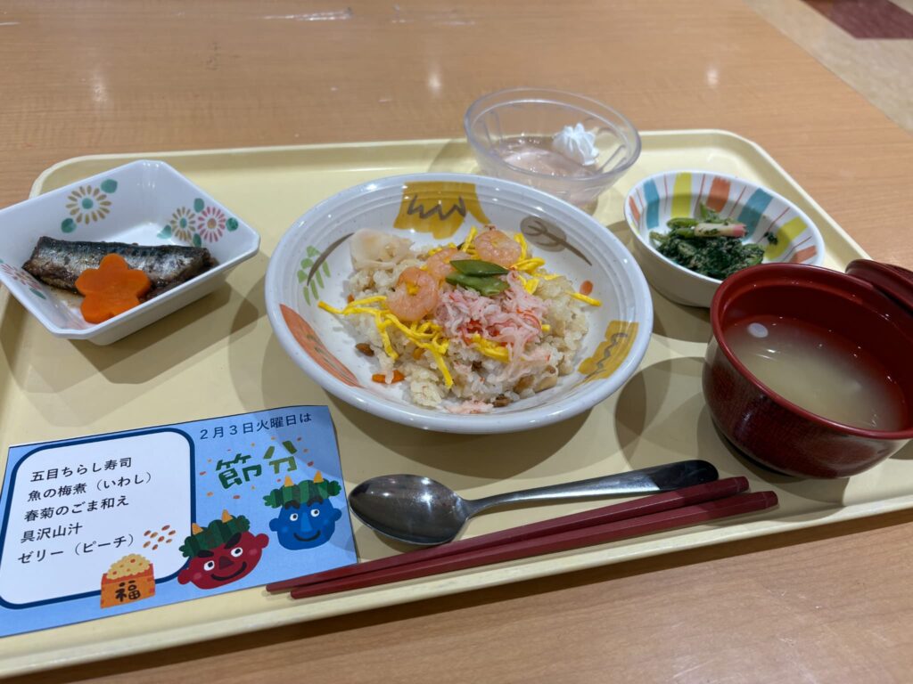 少し遅くなってしまいましたが、2月の節分のイベントについてご紹介します。 今年の節分献立は、五目豆が入った彩り豊かなちらし寿司といわしの梅煮です。 ちらし寿司はファミリーに大人気のメニューです。 そして、節分レクリエーションを開催! 鬼のイラストがついたピンめがけボールを転がし、鬼退治です。 見事に鬼を倒すと拍手と歓声があがりフロアは大盛り上がりでした。 そして最後は鬼と一緒に記念撮影。 これからも季節を感じられる行事をたくさん行ってまいります!