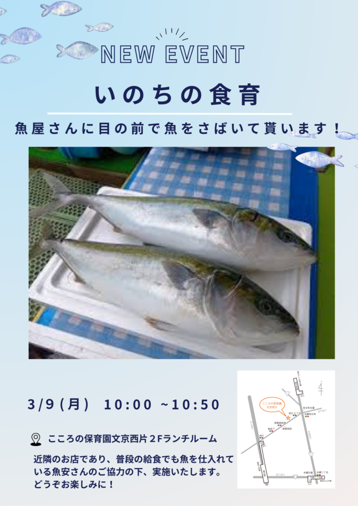 こころの保育園文京西片のいのちの食育(お魚解体ショー)を下記の通りに実施致します。