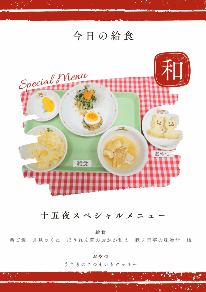 10月6日(日)は十五夜の日!こころの保育園では季節の行事に親しめるよう、スペシャルなランチとおやつを用意しました。