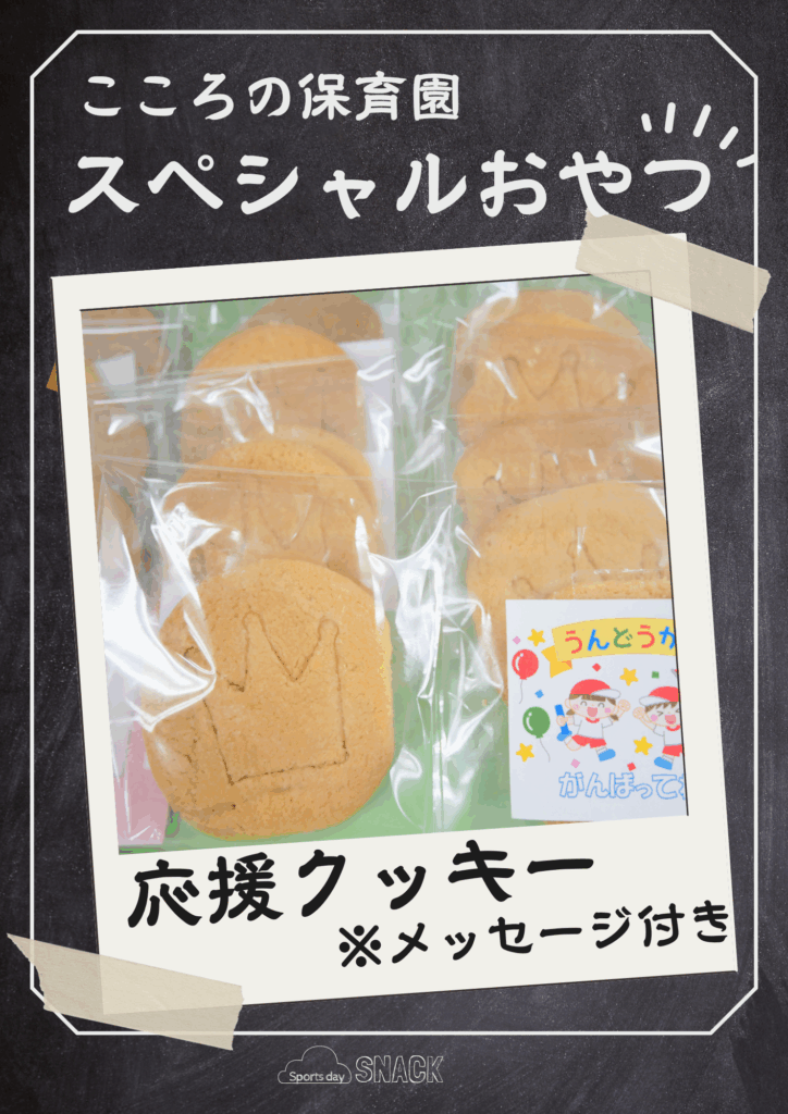 ・おやつは丸型にしたクッキーに、王冠の型をつけてメダルにしました。裏にはメッセージカード付きです!栄養士からの手紙であることを伝えられると嬉しそうにカードを持ち帰る姿が見られました。
