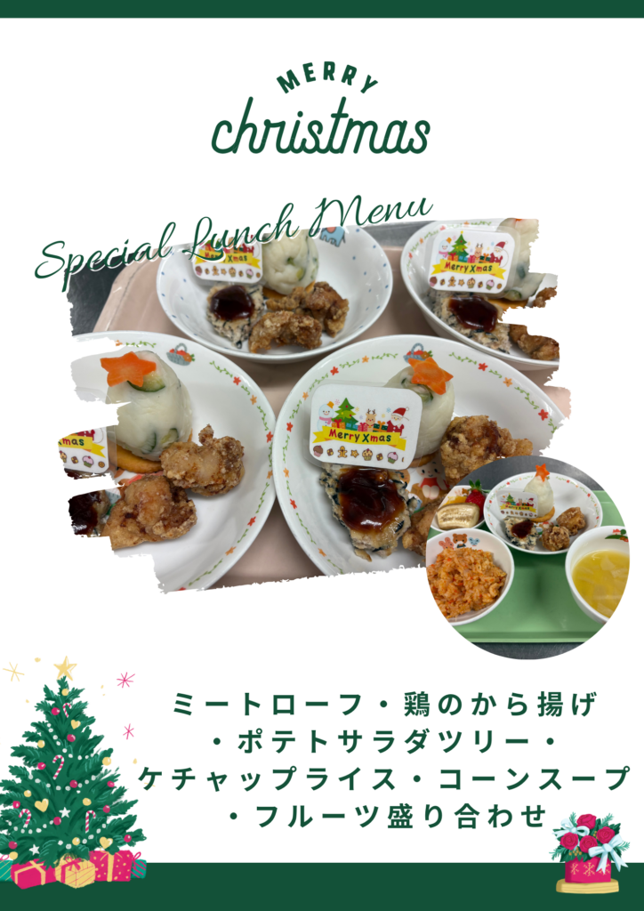 12月24日・25日はみんなが楽しみにしていたクリスマスとクリスマスイブ!こころの保育園ではイベントに期待を高めたり、楽しめるよう、特別なメニューを設定しました。